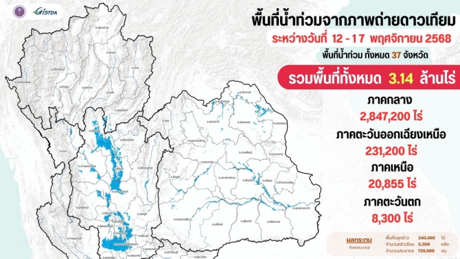 GISTDA เปิดเผยข้อมูลภาพถ่ายจากดาวเทียม สรุปสถานการณ์น้ำท่วมขังในรอบ 7 วัน (ระหว่างวันที่ 12-17 พฤศจิกายน 2568) พบว่ามีพื้นที่เสียหายแล้วกว่า 3.14 ล้านไร่ ครอบคลุมพื้นที่รวม 37 จังหวัด ในภาคเหนือตอนล่าง ภาคตะวันตก ภาคกลาง และภาคตะวันออกเฉียงเหนือ