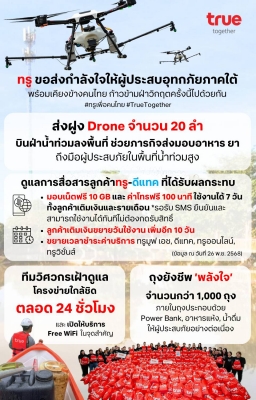 ทรู ระดมสรรพกำลัง เร่งช่วยผู้ประสบอุทกภัยพี่น้องชาวใต้ ส่งฝูงโดรน 20 ลำเสริมภารกิจ มอบถุงยังชีพ อาหาร–น้ำดื่ม–พาวเวอร์แบงค์ ดูแลการสื่อสารลูกค้าทรู–ดีแทค