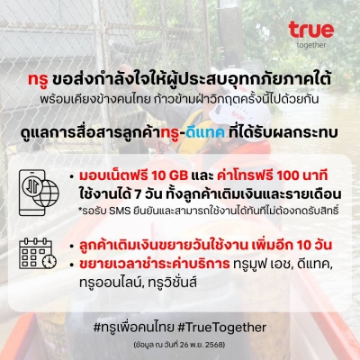 ทั้งนี้ ทรู คอร์ปอเรชั่น ขอเป็นส่วนหนึ่งส่งต่อกำลังใจให้แก่พี่น้องชาวใต้ทุกคน ขอให้สถานการณ์อุทกภัยกลับคืนสู่สภาวะปกติในเร็ววัน และขอให้ทุกคนปลอดภัย พร้อมก้าวข้ามเหตุการณ์ครั้งนี้ไปด้วยกัน