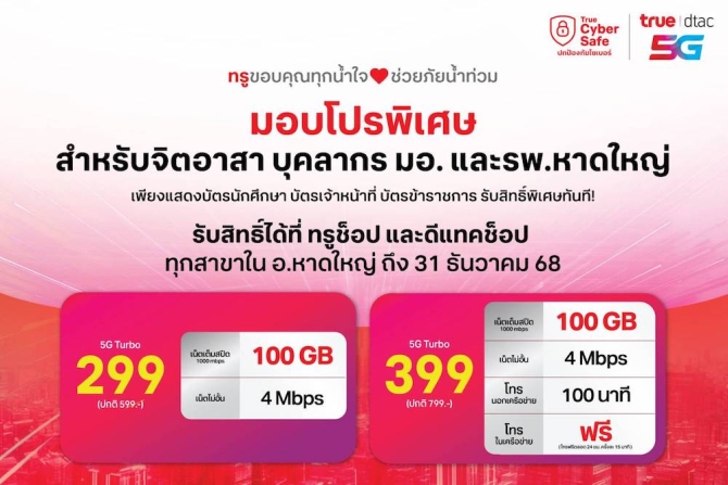 น้ำท่วมจากไป น้ำใจคงอยู่.....ทรู–ดีแทค พร้อมดูแลชาวหาดใหญ่–สงขลา ด้วยสมาร์ทโฟนราคาพิเศษเริ่มเพี ยง 99 บาท หรือ แพ็กเกจรายเดือนลด 50% รับสิทธิ์ได้ตั้งแต่วันนี้ถึงสิ้ นปี 68