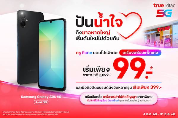 • Samsung Galaxy A06 5G เริ่มเพียง 99 บาท (ปกติ 2,899 บาท) พร้อมแพ็กเกจรายเดือน 599 บาท สำหรับลูกค้าทรูดีแทครายเดือนที่