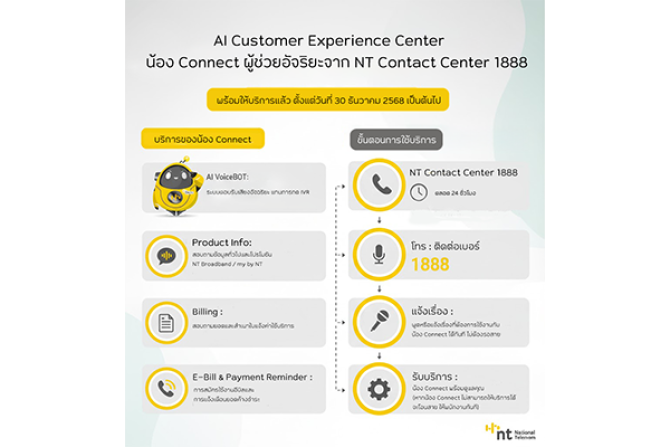 โดย NT เตรียมเปิดให้บริการระบบ AI Customer Experience Center “น้อง Connect” มาสคอตประจำองค์กร สำหรับให้บริการ AI VoiceBOT ทดแทนเสียง IVR ที่มีอยู่เดิม นับตั้งแต่วันที่ 30 ธันวาคมนี้เป็นต้นไป โดยผู้ใช้บริการสามารถสอบถามข้อมูลทั่วไป รวมถึงรายการส่งเสริมการขายของบริการ NT Broadband และ my by NT หรือแจ้งเรื่องที่ต้องการใช้บริการได้ผ่านทาง NT Contact Center 1888 ตลอด 24 ชั่วโมง