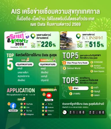 AIS เครือข่ายเชื่อมความสุขทุกเทศกาล ทั้งมือถือ-เน็ตบ้าน-วิดีโอสตรีมมิ่งโตแรงทั่วประเทศ เผย Data คืนเคานต์ดาวน์ของลูกค้าและคนไทยช่วงเทศกาลส่งท้ายปี ระหว่างวันที่ 31 ธันวาคม 2568 เวลา 06.00 น. – 1 มกราคม 2569 เวลา 06.00 น. สะท้อนความคึกคักของการเดินทางท่องเที่ยวและกิจกรรมเคานต์ดาวน์ทั่วประเทศ โดยเฉพาะแลนด์มาร์กที่สำคัญของกรุงเทพฯ ใจกลางเมือง สยามสแควร์ ซึ่งเป็นหนึ่งในพื้นที่จัดงานสำคัญ ที่ AIS ร่วมสร้างประสบการณ์เฉลิมฉลองผ่านเวที “SIAM SQUARE STREET OF DREAMZ 2026 presented by AIS SIAM” เปรียบเทียบการใช้งาน Data บนพื้นที่สยามสแควร์ ในวันที่ 31 ธ.ค. 68 กับปีที่แล้วพุ่งสูงขึ้นถึง 226% และแลนด์มาร์คสำคัญอย่างไอคอนสยาม ที่ AIS 5G Data ทะยายสูงขึ้นถึง 515% และพบว่ามีการใช้งานดาต้าในการสื่อสารผ่านโซเชียลมีเดียแพลตฟอร์มต่างๆ โดยเฉพาะ Facebook ที่มีปริมาณการใช้งานมากกว่า 28.3 ล้าน GB และยังคงเติบโตขึ้น ขณะที่ YouTube มีปริมาณการใช้งานกว่า 12.1 ล้าน GB ขณะที่ TikTok มีปริมาณการใช้งานกว่า 4.3 ล้าน GB พบว่าพฤติกรรมผู้ใช้งานที่กระจายการเสพคอนเทนต์ไปยังหลากหลายแพลตฟอร์มมากขึ้น สะท้อนว่าคนไทยใช้ชีวิตบนดิจิทัลเป็นฐาน (Digital-First) อย่างเต็มรูปแบบ จากพฤติกรรมการใช้งานที่เปลี่ยนเป็นดิจิทัลแบบ Embedded Digital