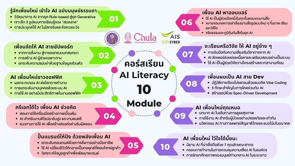 AIS ร่วมกับกระทรวงการอุดมศึกษา วิทยาศาสตร์ วิจัยและนวัตกรรม (อว.) และจุฬาลงกรณ์มหาวิทยาลัย เปิดตัวคอร์สเรียน “อุ่นใจไซเบอร์ : AI Literacy” สื่อการเรียนรู้ในรูปแบบดิจิทัลที่ออกแบบมาเพื่อยกระดับความรู้และทักษะด้านปัญญาประดิษฐ์ (AI) ของคนไทย พัฒนาโดยคณาจารย์ผู้เชี่ยวชาญด้าน AI จากหลากหลายสาขา ครอบคลุมตั้งแต่ความหมายของ AI การประยุกต์ใช้ในชีวิตประจำวัน ไปจนถึงการใช้งานอย่างปลอดภัย สร้างสรรค์ และมีจริยธรรม โดยมี อว. รับรองมาตรฐานเนื้อหา นอกจากนี้ ยังอยู่ระหว่างการต่อยอดหลักสูตรให้นิสิตนักศึกษาสามารถสะสมชั่วโมงการเรียนรู้จากคอร์สดังกล่าว เพื่อนำไปเทียบเป็นหน่วยกิตได้ในอนาคต
