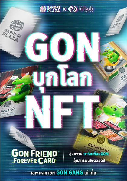 เตรียมสร้างปรากฏการณ์ครั้งใหม่ให้วงการธุรกิจอาหารอีกครั้ง บาร์บีคิวพลาซ่า ตำนานแห่งวงการปิ้งย่าง ประกาศจับมือกับ บิทคับ บล็อคเชน เทคโนโลยี (Bitkub Blockchain Technology) ผู้นำธุรกิจด้านสินทรัพย์ดิจิทัลและบล็อกเชนครบวงจร เปิดตัว GO(N)FT ครั้งแรก! นำเทคโนโลยี NFT มาเสริมกลยุทธ์การบริหารความสัมพันธ์กับสมาชิก (CRM) ตอบโจทย์ความนิยมบล็อกเชน ในปัจจุบัน โดยหยิบคาแรกเตอร์ พี่ GON ขวัญใจชาวปิ้งย่าง มาสคอตประจำแบรนด์ บาร์บีคิวพลาซ่า ดีไซน์เป็น GO(N)FT สุดน่ารัก น่าสะสม ผนึก Super Privilege ที่ไม่เคยมีมาก่อน มอบให้สมาชิก GON Gang Club ได้สิทธิ์การถือครอง ซึ่งจะเปิดลงทะเบียนรับ GO(N)FT ฟรี! จำนวน 90 ชิ้น ให้สมาชิก GON Gang Club ที่มีบัญชี Bitkub NEXT เตรียมตัวเป็นเจ้าของได้ตั้งแต่วันที่ 21-31 มีนาคม 2565 นี้ ผ่านทางช่องทาง Line @Gongang, เฟซบุ๊ก Gongang และเฟซบุ๊ก BarBQPlazaThailand