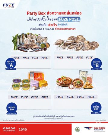 บริษัท ไปรษณีย์ไทย จำกัด ส่งโปรโมชันพิเศษเอาใจสายปาร์ตี้ ด้วยบริการขนส่งควบคุมอุณหภูมิ FUZE POST (ฟิ้วซ์โพสต์) ส่งเย็น ส่งเร็ว ส่งฟิ้วซ์ ยกขบวนอาหารสดคาวหวาน กับ 4 เซต Party BOX ประกอบด้วย เซต ขันโตก BOX / ซีฟู้ด BOX A / ซีฟู้ด BOX B และ เซตหวานใจ BOX ราคาเริ่มต้นเพียง 399 บาทพร้อมส่งตรงถึงบ้าน ให้ทุกท่านสามารถเลือกช้อปอาหารขึ้นชื่อประจำภาคในราคาสุดพิเศษ บนแพลตฟอร์ม ThailandPostMart ที่ไปรษณีย์ไทยพร้อมจัดส่งคงความสดใหม่ให้ถึงมือภายใน 1- 2 วัน ผู้ที่สนใจสามารถสั่งซื้อเซต “Party Box” บนเว็บไซต์ https://www.thailandpostmart.com ตั้งแต่วันนี้เป็นต้นไป - 15 มกราคม 2568