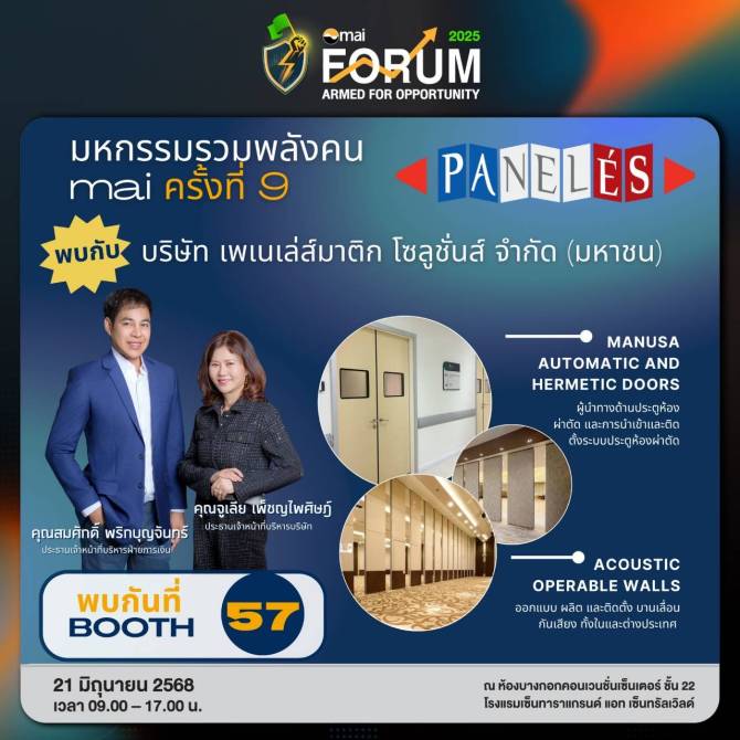 บอสหญิงสุดแกร่ง...“จูเลีย เพ็ชญไพศิษฎ์” CEO บมจ.เพเนเล่ส์มาติก โซลูชั่นส์ (PANEL) พร้อมขั้นสุด! เตรียมยกทัพจัดเต็มข้อมูลเด็ด ตอกย้ำความเป็นผู้นำด้านระบบประตูห้องผ่าตัด ประตูอัตโนมัติ ผนังบานเลื่อนกันเสียง และห้องเก็บเสียงเคลื่อนที่ รวมถึงเปิดมุมมองธุรกิจ วิสัยทัศน์การเติบโต และอัปเดตความคืบหน้าการเปิดโรงงานใหม่ ขยายกำลังผลิตกว่า 100% พบกันที่บูธ 57 ในงาน mai FORUM 2025 มหกรรมรวมพลังคน mai ครั้งที่ 9 ภายใต้แนวคิด “Armed for Opportunity ติดอาวุธ คว้าโอกาส ในตลาด mai” วันเสาร์ที่ 21 มิถุนายน 2568 เวลา 09.00-17.00 น. ณ ห้องบางกอกคอนเวนชั่นเซ็นเตอร์ ชั้น 22 โรงแรมเซ็นทาราแกรนด์ แอท เซ็นทรัลเวิลด์…โอกาสพิเศษดีๆแบบนี้ไม่ได้มีบ่อยๆ ห้ามพลาดเด็ดขาดคร้า !!