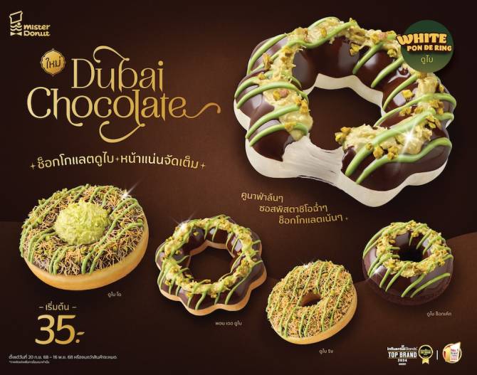 มิสเตอร์ โดนัทไม่พลาดที่จะจับกระแสเทรนด์ฮอต!เสิร์ฟเมนูใหม่ “ดูไบ ช็อกโกแลต” ความอร่อยที่มาพร้อมความหรูหราในทุกคำ”ผสมผสานความเข้มข้นของช็อกโกแลตแท้กับความกรุบกรอบของคูนาฟ่าและซอสพิสตาชิโอสุดพรีเมียมที่ราดฉ่ำอย่างจุใจสไตล์ดูไบ กับ 5 รสชาติราคาเริ่มต้นเพียงชิ้นละ 35 บาท ได้แก่ ไวท์พอน เดอ ดูไบ, พอน เดอ ดูไบ,ดูไบ ช็อกเค้ก, ดูไบ โด และ ดูไบ ริง ไปสัมผัสความอร่อยหน้าล้นคูนาฟ่ากรุบกรอบ ซอสพิสตาชิโอฉ่ำ ๆ ได้แล้วที่ร้าน มิสเตอร์ โดนัททุกสาขา ทั่วประเทศ ตั้งแต่วันนี้ – 16 พฤศจิกายน 2568