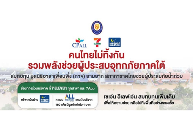 ซีพี ออลล์ - เซเว่น อีเลฟเว่น ขอเป็นสะพานบุญเชิญชวนสมาชิก All Member บริจาคคะแนน ALL Member ช่วยผู้ประสบภัยน้ำท่วมภาคใต้ ผ่าน 7App