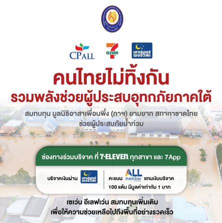 - ซีพี ออลล์ - เซเว่น อีเลฟเว่น ขอเป็นสะพานบุญเชิญชวนสมาชิก All Member บริจาคคะแนน ALL Member ช่วยผู้ประสบภัยน้ำท่วมภาคใต้ ผ่าน 7App 26 พ.ย. 2568