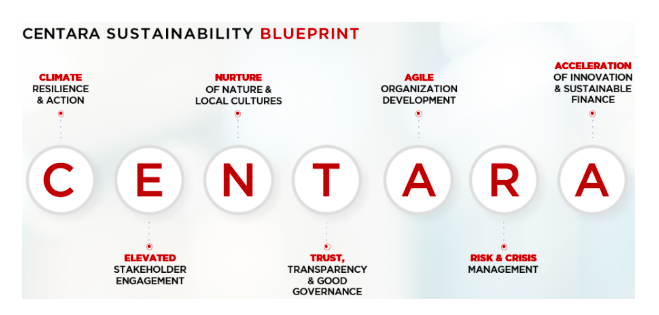 และเพื่อเป็นการตอกย้ำในเรื่องของวิสัยทัศน์ กลยุทธ์ และเป้าหมายด้าน ESGของบริษัท เซ็นทารายังได้ประกาศกลยุทธ์ด้านความยั่งยืนภายใต้ชื่อ C-E-N-T-A-R-A Sustainability Blueprint ซึ่งถือเป็นหัวใจสำคัญของการดำเนินธุรกิจของเซ็นทารา เพื่อใช้ในการกำหนดทิศทางและพัฒนาหลักปฏิบัติงานด้านสิ่งแวดล้อมขององค์กรในระยะยาวโดยกลยุทธ์นี้ แยกออกเป็น 7 หัวข้อ อันได้แก่