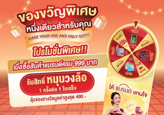 Lucky Wheel เมื่อซื้อสินค้าแบรนด์ครบ 999 บาท รับสิทธิ์ร่วมกิจกรรมวงล้อลุ้นรางวัล มูลค่าสูงสุด 490 บาท