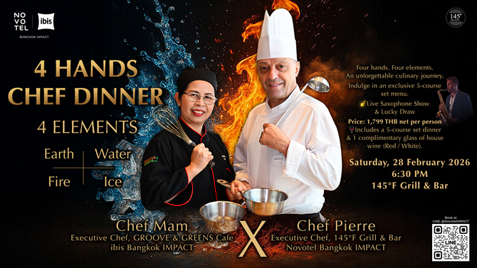 วันเสาร์ที่ 28 กุมภาพันธ์ 2569 เวลา 18.30–22.00 น. ณ ห้องอาหาร 145 กริล แอนด์ บาร์ โรงแรม โนโวเทล กรุงเทพ อิมแพ็ค ราคา 1,799 บาทสุทธิ/ท่าน (สมาชิก ALL Accor Plus รับส่วนลด 20%)