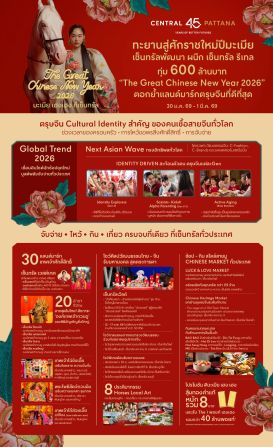 ร่วมฉลองเทศกาลตรุษจีนปีมะเมียกับแคมเปญ “The Great Chinese New Year 2026” ตั้งแต่วันที่ 30 มกราคม – 1 มีนาคม 2569 ที่ศูนย์การค้าเซ็นทรัลและร้านค้าในเครือเซ็นทรัล รีเทล กว่า 3,000 แห่งทั่วประเทศ และเอสพละนาด รัชดา