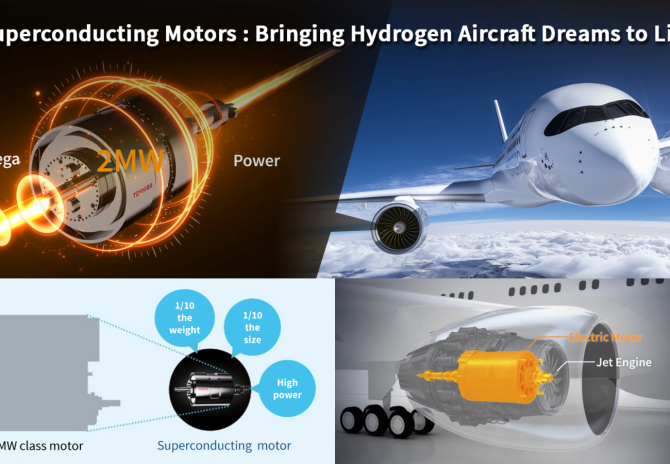 ในขณะที่ภาคอุตสาหกรรมการบินเร่งรีบปรับตัว เพื่อให้บรรลุการปล่อยก๊าซคาร์บอนไดออกไซด์ (CO₂) สุทธิเป็นศูนย์ภายในปี 2593 นวัตกรรมที่จะก้าวข้ามขีดจำกัดในการใช้เชื้อเพลิงการบินที่ยั่งยืนถือได้ว่ามีส่วนสำคัญเป็นอย่างมาก โดยเฉพาะ “มอเตอร์ตัวนำยิ่งยวด” ของโตชิบานั้นมีความน่าสนใจเป็นอย่างมาก ด้วยมีขนาดที่กะทัดรัด และน้ำหนักเบา มีผลลัพธ์ของการทำงานที่สูงสำหรับระบบขับเคลื่อนด้วยไฟฟ้า ด้วยน้ำหนักที่เบากว่าหนึ่งในสิบ และขนาดที่เล็กกว่ามอเตอร์ระดับ 2MW-class แบบทั่วไป ซึ่งขนาดและน้ำหนักที่ลดลงอย่างมากนี้ ถือเป็นตัวเปลี่ยนเกมของอุตสาหกรรมการบิน ซึ่งทุกกิโลกรัมมีความสำคัญและต้องใช้กำลังขับเคลื่อนที่สูง