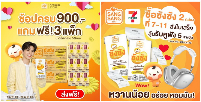 กุมภาพันธ์นี้มีแต่ความฟิน! นมถั่วเหลืองแบรนด์ ซังซัง ชวนทุกคนมาร่วมส่งต่อความอร่อยเพื่อลุ้นรางวัลใหญ่ Giftset Sangsang พร้อมหูฟัง Hoco มูลค่า 990 บาท จำนวน 5 รางวัล กติกาง่าย ๆ เพียงซื้อซังซัง ขนาด 300 มล. จำนวน 2 กล่อง ที่ 7-Eleven ทุกสาขา แล้วเขียนชื่อลงบนใบเสร็จให้ชัดเจน แล้วถ่ายรูปใบเสร็จให้เห็นรายการซื้อนมถั่วเหลืองซังซัง จากนั้นโพสต์รูปใบเสร็จพร้อมรีวิวความอร่อยชวนเพื่อน ๆ มาดื่มและบอกพิกัด 7-Eleven โซนที่ซื้อ ลงในคอมเมนต์ใต้โพสต์กิจกรรมเพื่อยืนยันการร่วมกิจกรรม โดยสามารถร่วมสนุกและโชว์รีวิวที่โดนใจที่สุดได้ตั้งแต่วันนี้ถึง 28 กุมภาพันธ์ 2569 ประกาศผลผู้โชคดีวันที่ 5 มีนาคม 2569 และยืนยันสิทธิ์ภายในวันที่ 10 มีนาคม 2569 ติดตามรายละเอียดเพิ่มเติมได้ที่ https://bit.ly/3w0PQ5o