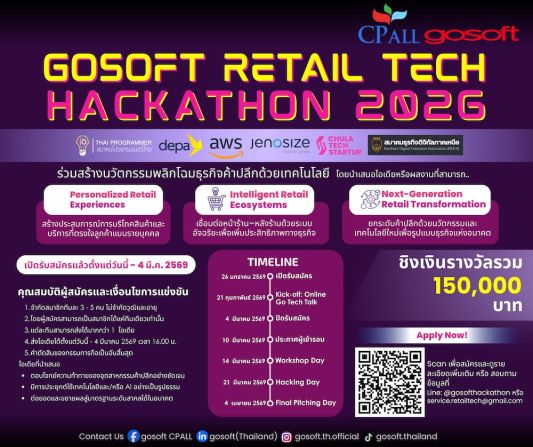กลับมาอีกครั้งกับการประกวดไอเดียเพื่อพัฒนาธุรกิจค้าปลีกให้ก้าวไปไกลกว่าที่เคย “GOSOFT RETAIL TECH HACKATHON 2026” จัดโดย บริษัท โกซอฟท์ (ประเทศไทย) จำกัด ผู้นำด้าน Retail Technology ในกลุ่มธุรกิจซีพี ออลล์ เวทีนี้เปิดโอกาสให้แก่ทุกคน ไม่จำกัดคุณสมบัติ ไม่ว่าจะเป็นนักเรียน นักศึกษา หรือ นวัตกร สามารถเสนอไอเดียหรือโซลูชัน โดยนำเทคโนโลยีมาพัฒนาและปรับปรุงธุรกิจ Retail ของไทย ยกระดับให้ก้าวไกลสู่สากล