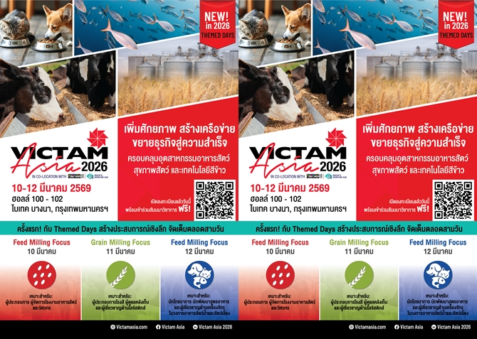 วิคแทม อินเตอร์เนชันแนล ร่วมกับพันธมิตร ขอเชิญร่วมงาน VICTAM Asia & GRAPAS Asia 2026 มหกรรมสินค้าและเทคโนโลยีระดับนานาชาติด้านอุตสาหกรรมอาหารสัตว์ การสีข้าว โม่แป้ง และ แปรรูปธัญพืชครบวงจร จัดขึ้นพร้อมกับ VIV Health & Nutrition Asia 2026 และ Horti & Agri Asia 2026 วันที่ 10–12 มีนาคม 2569 ณ ศูนย์นิทรรศการและการประชุมไบเทค บางนา กรุงเทพฯ