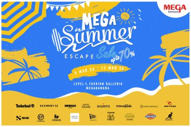 เตรียมความพร้อมก่อนออกเดินทางในฤดูกาลแห่งการท่องเที่ยวกับงาน “MEGA SUMMER ESCAPE SALE” งานช้อปปิ้งที่รวบรวมไอเทมเอาต์ดอร์ และ SPORT-ACTIVE LIFESTYLE ไว้อย่างครบครันในที่เดียว พร้อมโปรโมชันพิเศษลดสูงสุด 70% ให้ทุกทริปซัมเมอร์ของคุณเต็มไปด้วยความสนุก มีสไตล์ และความมั่นใจ ตั้งแต่วันที่ 5–17 มีนาคม 2569 ณ โซนแฟชั่น แกลเลอเรีย ชั้น 1 เมกาบางนา
