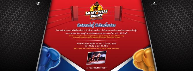 ร่วมเปิดประสบการณ์ความสนุก ช้อป ชิม และชมการแสดงสุดเร้าใจ ได้ในงาน Muay Thai Spirit 2026 ตั้งแต่วันนี้ถึง 29 มีนาคม 2569 ณ ศูนย์การค้าแพลทินัม แฟชั่น มอลล์ ติดตามรายละเอียดร้านค้