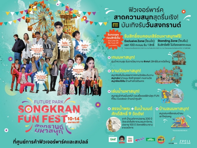 ศูนย์การค้าฟิวเจอร์พาร์ค และสเปลล์ เดินหน้าสร้างความสุขต้อนรับซั มเมอร์และเทศกาลปีใหม่ไทย เนรมิตพื้นที่ทั่วศูนย์การค้าฯ ภายใต้คอนเซ็ปต์ “ปล่อยใจสนุก สุขรับซัมเมอร์: เล่น กิน ช้อป แชะรูปสุดฉ่ำ!” พร้อมจัดงานใหญ่ “FUTURE PARK SONGKRAN FUN FEST” สงกรานต์มหาสนุก ขนทัพศิ ลปินลูกทุ่งชื่อดัง และศิลปินระดับตำนาน คอนเสิร์ต 5 วันเต็ม ตั้งแต่วันที่ 10 – 14 เมษายน 2569