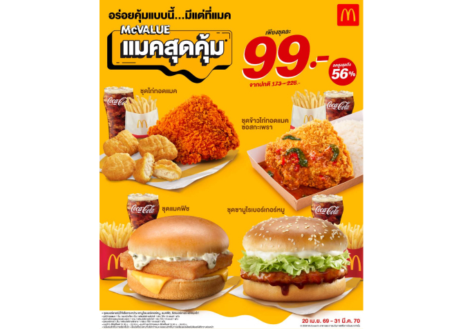 - แมคโดนัลด์ ตอกย้ำกลยุทธ์ความคุ้มค่า ‘Value for Money’ ยืนยันราคาเดิม ‘แมคสุดคุ้ม’ 99 บาท 23 เม.ย. 2569