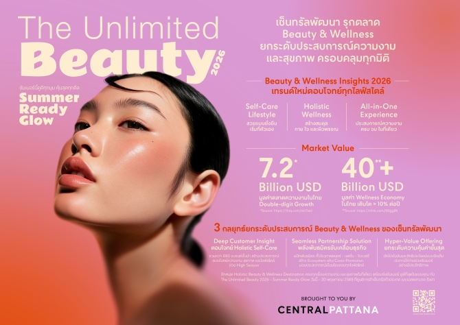ดร.ณัฐกิตติ์ ตั้งพูลสินธนา กรรมการผู้จัดการใหญ่ สายงานการตลาด บมจ.เซ็นทรัลพัฒนา กล่าวว่า “ตลาด Beauty & Wellness โลกเติบโตต่อเนื่อง โดยเฉพาะในประเทศไทยมีมูลค่าตลาดความงามกว่า 7.2 พันล้านดอลลาร์* และเติบโตระดับ Double-digit ต่อเนื่อง ขณะที่ Wellness Economy ไทยมีมูลค่ามากกว่า 40,000 ล้านดอลลาร์ และเติบโตสูงถึงกว่า 10% ต่อปี** สอดคล้องกับอินไซต์ผู้บริโภคที่ใส่ใจกับ ‘Self-Care’ และ ‘Holistic Wellness’ มากขึ้นในทุกมิติ และมองหา ‘ประสบการณ์แบบครบวงจร’ ที่สามารถตอบโจทย์ทั้งความงาม สุขภาพ และไลฟ์สไตล์ในที่เดียว สำหรับแคมเปญ “The Unlimited Beauty 2026 – Summer Ready Glow” เซ็นทรัลพัฒนา จึงใช้จุดแข็งของเราในการรวมแบรนด์กว่า 690 แบรนด์ เข้ากับ Loyalty Program อย่าง The 1 และพันธมิตรทางธุรกิจ เพื่อสร้าง Seamless Customer Journey ตั้งแต่การสร้างแรงบันดาลใจ ไปจนถึงการตัดสินใจซื้อ และการกลับมาใช้บริการซ้ำ ซึ่งไม่เพียงช่วยเพิ่ม Spending แต่ยังยกระดับศูนย์การค้าให้เป็น Beauty & Wellness Destination อย่างแท้จริง”