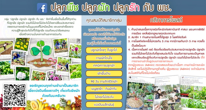 ในตอนท้ายของการประชุม อธิบดีกรมการพัฒนาชุมชน ฝากเชิญชวนเจ้าหน้าที่และเครือข่ายให้เข้าร่วมเป็นสมาชิก Facebook กลุ่ม “ปลูกพืช ปลูกผัก ปลูกรัก กับ พช.” ซึ่งคำว่า กับ พช. คือพัฒนาชุมชนเป็นผู้ประสานร่วมกับทุกหน่วยงาน ทบวง กระทรวง กรม และเอกชน ขับเคลื่อนการสร้างความมั่นคงทางอาหาร การมีพืชผักสวนครัวที่ปลอดภัยทำอาหารกิน หรือทำให้คนไทยมีอาหารเป็นยา และมีความรักความสามัคคีในครอบครัว โดยขอให้ช่วยกันเชิญชวนประชาชนมาเข้าร่วมเป็นสมาชิก เพื่อช่วยกันแชร์ภาพความสุขแห่งการปลูกพืชผักสวนครัว หรือต้นไม้อื่น ๆ เพื่อเป็นแรงสั่นสะเทือนให้กับสังคมต่อไป