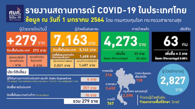 วันที่ 1 มกราคม พ.ศ.2564 ที่ทำเนียบรัฐบาล นพ.ทวีศิลป์ วิษณุโยธิน โฆษกศูนย์บริหารสถานการณ์การแพร่ระบาดของโรคติดเชื้อไวรัสโคโรนา 2019 (โควิด-19) หรือ ศบค. แถลงว่า สถานการณ์ประเทศไทย มีผู้ติดเชื้อรายใหม่ 279 ราย แบ่งเป็นติดเชื้อภายในประเทศ 257 ราย แรงงานต่างด้าวจากการคัดกรองเชิงรุก 16 ราย และสถานที่กักกันที่รัฐจัดให้ 6 ราย ผู้ป่วยยืนยันสะสม 7,163 ราย หายป่วยแล้ว 4,273 ราย เสียชีวิตสะสม 63 ราย