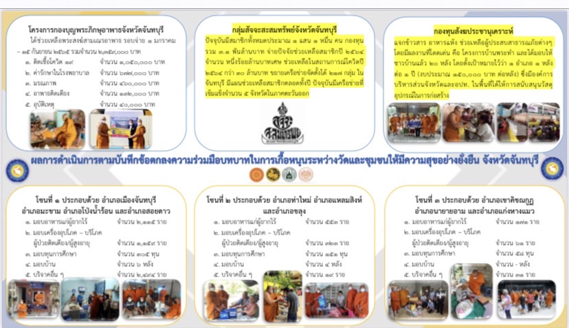 ในการนี้ ปลัดกระทรวงมหาดไทย กล่าวว่า ผลการดำเนินงานตามบันทึกข้อตกลงความร่วมมือบทบาทในการเกื้อหนุนระหว่างวัดและชุมชนให้มีความสุขอย่างยั่งยืน จังหวัดจันทบุรี มีความสำเร็จอย่างเป็นรูปธรรมในการช่วยเหลือประชาชนในพื้นที่ผ่านหลากหลายกิจกรรมสำคัญ ได้แก่ (1) โครงการกองบุญพระภิกษุอาพาธจังหวัดจันทบุรี ซึ่งได้ช่วยเหลือพระสงฆ์สามเณรอาพาธ รอบจ่าย 1 มกราคม – 15 กันยายน 2565 รวมจำนวน 2,359,000 บาท แบ่งออกเป็น ผู้ป่วยติดเชื้อโควิด-19 จำนวน 1,050,000 บาท ค่ารักษาในโรงพยาบาล จำนวน 677,000 บาท มรณภาพ จำนวน 460,000 บาท อาพาธติดเตียง จำนวน 132,000 บาท และอุบัติเหตุจำนวน 40,000 บาท (2) กลุ่มสัจจะสะสมทรัพย์จังหวัดจันทบุรี ซึ่งปัจจุบันมีสมาชิกทั้งหมดประมาณ 110,000 คน กองทุนรวมกว่า 3.1 พันล้านบาท โดยได้จ่ายปัจจัยช่วยเหลือสมาชิกในปี 2564 จำนวน 100 ล้านบาทเศษ และช่วยเหลือในสถานการณ์โควิด ปี 2564 กว่า 30 ล้านบาท ซึ่งมีการขยายเครือข่ายจัดตั้งรวม 217 กลุ่ม ในจังหวัดจันทบุรี และมีแผนช่วยเหลือสมาชิกตลอดทั้งปี ซึ่งปัจจุบันมีเครือข่ายที่เข้มแข็งจำนวน 5 จังหวัดในภาคตะวันออกด้วย (3) กองทุนสังฆประชานุเคราะห์ ได้มีการแจกข้าวสาร อาหารแห้งเพื่อช่วยเหลือผู้ประสบสาธารณภัยต่างๆ ซึ่งมีผลงานที่โดดเด่น คือ โครงการบ้านพระทำ ซึ่งได้มอบบ้านให้ชาวบ้านแล้ว 20 หลัง ตั้งเป้าหมายไว้ว่า 1 อำเภอ 1 หลัง ต่อ 1 ปี (งบประมาณ 150,000 บาท ต่อหลัง) โดยที่มีองค์การบริหารส่วนจังหวัด และ อปท. ในพื้นที่ให้การสนับสนุนวัสดุอุปกรณ์สำหรับการก่อสร้าง (4) การดำเนินงานในโซนที่ 1 พื้นที่อำเภอเมืองจันทบุรี อำเภอมะขาม อำเภอโป่งน้ำร้อน และอำเภอสอยดาว ได้มีการมอบอาหารแก่ผู้ยากไร้ จำนวน 2,115 ราย มอบเครื่องอุปโภค – บริโภคแก่ผู้ป่วยติดเตียง/ผู้สูงอายุ จำนวน 1,159 ราย มอบทุนการศึกษา จำนวน 305 ทุน มอบบ้าน จำนวน 6 หลัง และการบริจาคอื่นๆ จำนวน 2,494 ราย (5) การดำเนินงานโซนที่ 2 พื้นที่อำเภอท่าใหม่ อำเภอแหลมสิงห์ และอำเภอขลุง มีมอบอาหารแก่ผู้ยากไร้ จำนวน 553 ราย มอบเครื่องอุปโภค – บริโภคผู้ป่วยติดเตียง/ผู้สูงอายุ จำนวน 323 ราย มอบทุนการศึกษา จำนวน 151 ทุน มอบบ้าน จำนวน 4 หลังและการบริจาคอื่นๆ จำนวน 19 ราย และ (6) การดำเนินงานในโซนที่ 3 พื้นที่อำเภออำเภอเขาคิชฌกูฏ อำเภอนายายอาม และอำเภอแก่งหางแมว ได้มีการมอบอาหารแก่ผู้ยากไร้ จำนวน 171 ราย มอบเครื่องอุปโภค – บริโภคผู้ป่วยติดเตียง/ผู้สูงอายุ จำนวน 61 รายมอบทุนการศึกษา จำนวน 58 ทุน และบริจาคอื่นๆ จำนวน 31 ราย