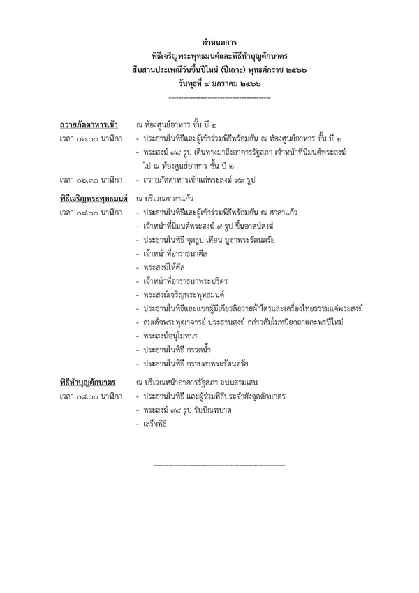เมื่อวันที่ 3 มกราคม 2566 ผู้สื่อข่าวรายงานว่า วันที่ 4 มกราคม 2566 เวลา 06.00 น.รัฐสภาขอเชิญร่วมพิธีเจริญพระพุทธมนต์และทำบุญตักบาตรพระสงฆ์จาก 9 วัดพระอารามหลวง จำนวน 99 รูปมีสมเด็จพระพุฒาจารย์ กรรมการมหาเถรสมาคม เจ้าคณะใหญ่หนตะวันออก เจ้าอาวาสวัดไตรมิตรวิทยาราม เป็นประธาน เพื่อเป็นการสืบสานวันขึ้นปีใหม่