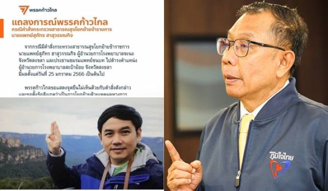 ล่าสุด พรรคก้าวไกลออกแถลงการณ์คัดค้านการย้ายแพทย์สุภัทร ฮาสุวรรณกิจ ผู้อำนวยการโรงพยาบาลจะนะ และประธานชมรมแพทย์ชนบท ไปดำรงตำแหน่งผู้อำนวยการโรงพยาบาลสะบ้าย้อย จังหวัดสงขลา มีผลตั้งแต่วันที่ 25 มกราคม 2566 เป็นต้นไป โดยตั้งข้อสงสัยว่าเป็นการย้าย ที่มีเรื่องของ “การเมือง” แอบแฝง และลงชื่อหัวหน้าพรรค คุณพิธา ว่ารับทราบกับแถลงการณ์ฉบับนี้