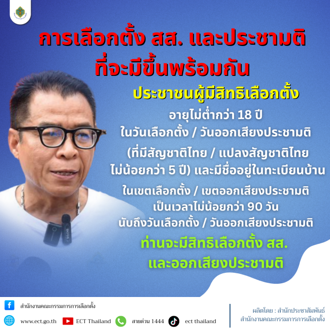 สำนักงานคณะกรรมการการเลือกตั้ง ขอประชาสัมพันธ์คุณสมบัติและลักษณะต้องห้ามของผู้มีสิทธิเลือกตั้งและออกเสียงประชามติที่เหมือนกันดังนี้
