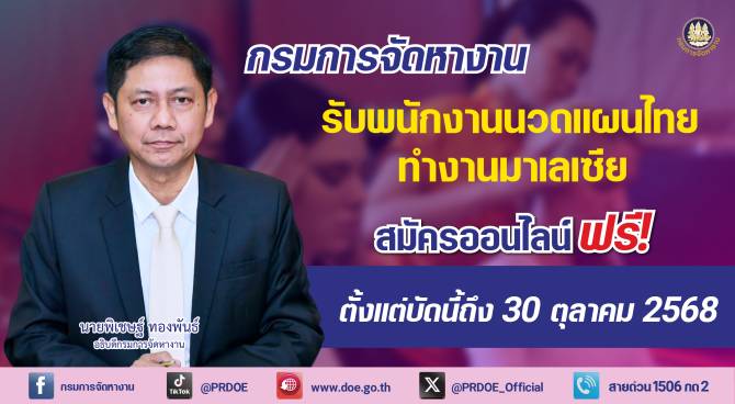 โอกาสทอง! กรมการจัดหางาน เปิดรับพนักงานนวดแผนไทย ทำงานมาเลเซีย สวัสดิการแน่น สมัครออนไลน์ ฟรี!