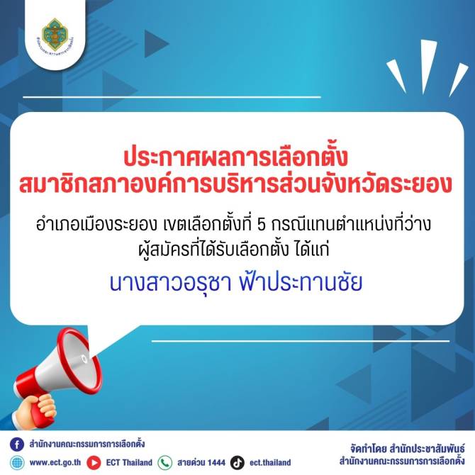 กกต.ประกาศผลการเลือกตั้งสมาชิกสภาองค์การบริหารส่วนจังหวัดระยอง อำเภอเมืองระยอง เขตเลือกตั้งที่ 5 กรณีแทนตำแหน่งที่ว่าง
