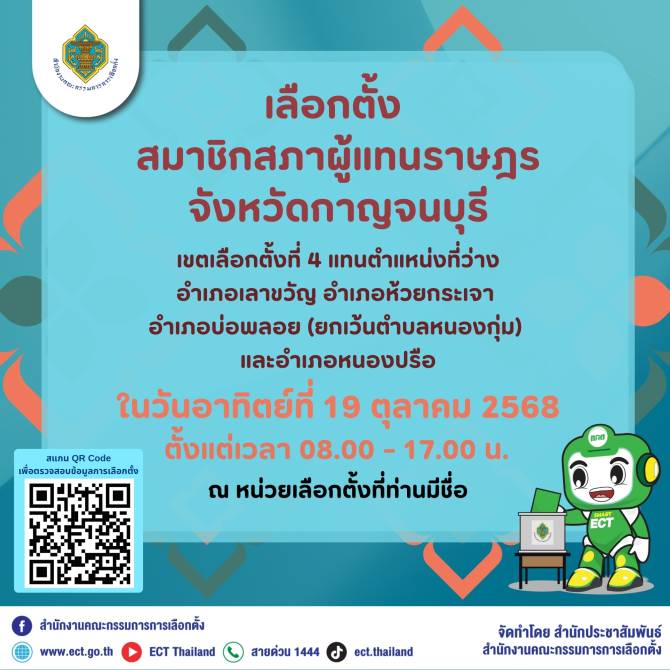 กกต.เชิญชวน เลือกตั้งซ่อม สส. กาญจนบุรี เขตเลือกตั้งที่ 4 วันอาทิตย์ที่ 19 ตุลาคม 2568 "สร้างสรรค์ประเทศไทย พร้อมใจไปเลือกตั้ง"