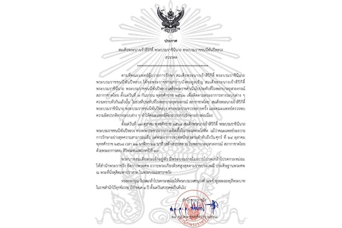 วันที่ 25 ตุลาคม 2568 สำนักพระราชวัง ออกประกาศเรื่อง สมเด็จพระนางเจ้าสิริกิติ์ พระบรมราชินีนาถ พระบรมราชชนนีพันปีหลวง สวรรคต ระบุว่า ตามที่คณะแพทย์ผู้ถวายการรักษา สมเด็จพระนางเจ้าสิริกิติ์ พระบรมราชินีนาถ พระบรมราชชนนีพันปีหลวง ได้ขอพระราชทานกราบบังคมทูลเชิญ สมเด็จพระนางเจ้าสิริกิติ์ พระบรมราชินีนาถ พระบรมราชชนนีพันปีหลวง เสด็จพระราชดำเนินไปประทับที่โรงพยาบาลจุฬาลงกรณ์ สภากาชาดไทย ตั้งแต่วันที่ 7 กันยายน พุทธศักราช 2562 เพื่อติดตามอาการทางระบบต่างๆ ความทราบทั่วกันแล้วนั้น ในช่วงที่ประทับที่โรงพยาบาลจุฬาลงกรณ์ สภากาชาดไทย สมเด็จพระนางเจ้าสิริกิติ์ พระบรมราชินีนาถ พระบรมราชชนนีพันปีหลวง ทรงพระประชวรหลายครั้ง และคณะแพทย์ตรวจพบความผิดปรกติทางระบบต่างๆ ทำให้คณะแพทย์ต้องถวายการรักษาอย่างต่อเนื่อง