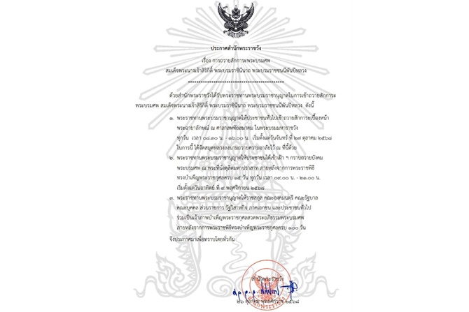 ประกาศสำนักพระราชวังเรื่อง การถวายสักการะพระบรมศพ สมเด็จพระนางเจ้าสิริกิติ์ พระบรมราชินีนาถ พระบรมราชชนนีพันปีหลวง