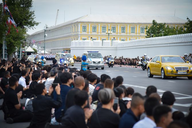 พระบาทสมเด็จพระเจ้าอยู่หัว และสมเด็จพระนางเจ้าฯ พระบรมราชินีเสด็จพระราชดำเนินไปประทับรถยนต์พระที่นั่ง พร้อมด้วยพระบรมวงศานุวงศ์ ตามรถยนต์หลวงเชิญพระบรมศพออกจากโรงพยาบาลจุฬาลงกรณ์ สภากาชาดไทยไปยังพระบรมมหาราชวัง โดยใช้เส้นทางถนนอังรีดูนังต์ เลี้ยวขวาออกเส้นถนนพระราม 4 แยกสามย่าน แล้วเลี้ยวขวาเข้าถนนพญาไท ผ่านแยกพญาไทแล้วเลี้ยวซ้ายเข้าถนนศรีอยุธยา ผ่านอุทยานเฉลิมพระเกียรติพระบาทสมเด็จพระ บรมชนกาธิเบศร์ฯ และวัดเบญจมบพิตรดุสิตวนารามราชวรมหาวิหาร แล้วเลี้ยวซ้ายถนนราชดำเนินนอก-กลาง-ใน มุ่งหน้าสู่พระบรมมหาราชวัง