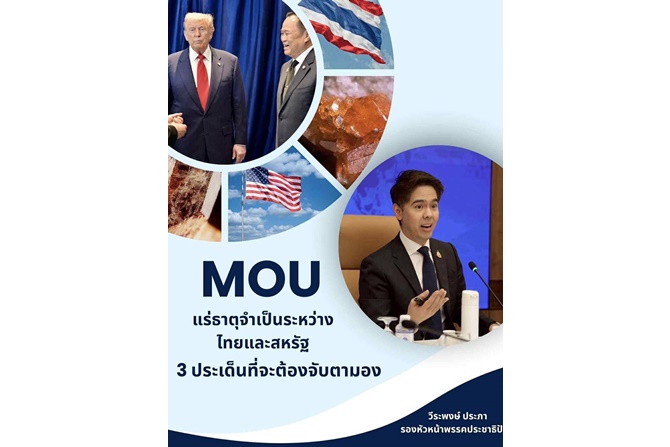 เมื่อวันที่ 26 ตุลาคม 2568 นายวีระพงษ์ ประภา รองหัวหน้าพรรคประชาธิปัตย์ ได้โพสต์ข้อความผ่านทางเฟซบุ๊ก อาร์ท วีระพงษ์ ประภา - Art Werapong วิเคราะห์ถึงผลกระทบและความท้าทายจากประกาศบันทึกความเข้าใจร่วม (MOU) ระหว่างรัฐบาลไทยและสหรัฐอเมริกา ว่าด้วยความร่วมมือด้านแร่ธาตุจำเป็น (Critical Minerals) โดยระบุว่าเป็นประเด็นที่ต้องจับตามองอย่างใกล้ชิด เพราะอาจมีผลอย่างมากต่อเศรษฐกิจ ความมั่นคง และสิ่งแวดล้อมของไทย