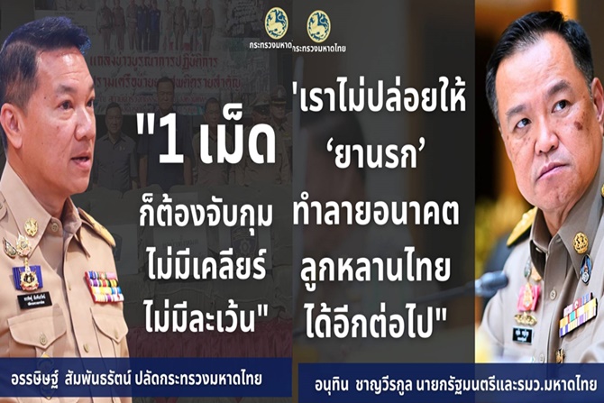 มหาดไทยบูรณาการทุกพื้นที่ "ทำสงครามยานรก" 15 วัน จับยาบ้าแล้ว 23 ล้านเม็ด ไอซ์ 500 กก. ลุยกวาดล้างทุกซอกทุกมุม ไม่มีละเว้น 1 เม็ดก็ผิดกฎหมาย