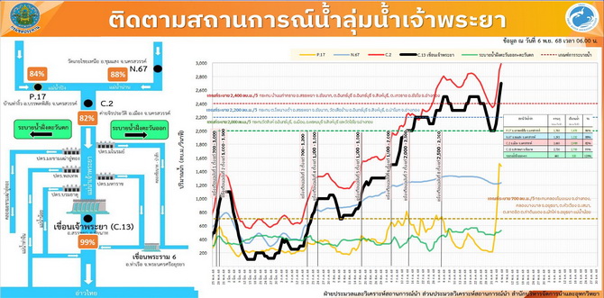กรมชลประทาน คาดการณ์ว่าปริมาณน้ำที่สถานีวัดน้ำ C.2 จังหวัดนครสวรรค์ มีแนวโน้มเพิ่มขึ้นประมาณ 2,900 – 3,000 ลบ.ม./วินาที และปริมาณน้ำจากแม่น้ำสะแกกรังและลำน้ำสาขาเพิ่มขึ้นประมาณ 400 ลบ.ม./วินาที ซึ่งจะทำให้ปริมาณน้ำเหนือเขื่อนเจ้าพระยามีประมาณ 3,300 – 3,400 ลบ.ม./วินาที และรับน้ำเข้าระบบชลประทานฝั่งตะวันออกและฝั่งตะวันตกรวม 550 ลบ.ม./วินาที