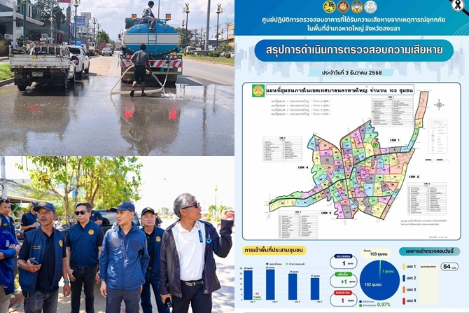 เมื่อวันที่ 3 ธันวาคม 2568 นายพงษ์นรา เย็นยิ่ง อธิบดีกรมโยธาธิการและผังเมือง ได้สั่งการเชิงรุกให้ นายเกิดศักดิ์ ยะโสธร รองอธิบดีกรมโยธาธิการและผังเมือง ในฐานะประธานศูนย์ปฏิบัติการฟื้นฟูเมืองฯ (ส่วนหน้า) ลงพื้นที่วางแผนการทำงานร่วมกับทีมงานและหน่วยงานเครือข่าย ทั้งนี้ในวันเดียวกัน คณะได้ร่วมกับ นายสาคร นิลรัตน์ นายนรินทร์ กวางทอง ผู้ตรวจราชการกรมโยธาธิการและผังเมือง นายไมตรี สรรพสิน โยธาธิการและผังเมืองจังหวัดสงขลา บูรณาการความร่วมมือกับผู้นำชุมชน พร้อมนำทีมนายช่าง วิศวกร ลงพื้นที่สำรวจ ตรวจสอบความเสียหายบ้านเรือน/อาคาร ของพี่น้องประชาชน ซึ่งได้นำร่องในพื้นที่เขตที่ 1 ชุมชนพรุแม่สอน และประชาสัมพันธ์พร้อมทำความเข้าใจแผนการดำเนินการสำรวจความเสียหาย และช่องทางการติดต่อขอรับบริการตรวจสอบบ้านเรือน/อาคาร ร่วมกับผู้นำชุมชน ทั้ง 4 เขต จำนวน 900 หลังคาเรือน เพื่อคืนความปลอดภัยและบรรเทาความเดือดร้อนของประชาชนให้เร็วที่สุด