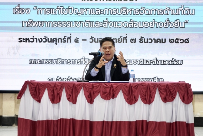 โดยนายวราวุธ กล่าวตอนหนึ่งว่า หากเราไม่จัดการเรื่องปัญหาที่ดินและสิ่งแวดล้อมแล้วชีวิตของเราทุกคนโดยเฉพาะคนรุ่นใหม่ที่จะต้องรับไม้ต่อนั้นยิ่งจะทวีความรุนแรงหนักหนาสาหัสจากปัจจุบันมากขึ้น เชื่อว่าทุกคนได้ทราบข่าวน้ำท่วมที่ภาคใต้โดยเฉพาะอำเภอหาดใหญ่จังหวัดสงขลาแล้ว และหลายอำเภอในจังหวัดสุพรรณบุรีเองที่เราจะเห็นว่าก็มีน้ำท่วมอยู่เช่นกัน บางคนบอกว่าท่วมไม่มากแค่ชั้นหนึ่งแต่ยังเหลือชั้นสองไว้ให้อยู่อาศัย บางคนก็บอกว่าโชคยังดีที่ได้เห็นหลังคาบ้านอยู่บ้าง สถานการณ์ที่เกิดขึ้นกับประเทศไทยนี้หนักขึ้นทุกปี โดยเฉพาะที่อำเภอหาดใหญ่นั้นมีข้อมูลชัดเจนว่าเคยเกิดขึ้นมาแล้ว ระหว่างวันที่ 22 - 24 พฤศจิกายน 2543 หรือ 25 ปีที่ผ่านมา เกิดเหตุการณ์เดียวกันเช่นนี้เป๊ะ คือน้ำท่วม2-3 เมตร ท่วมหลังคาบ้าน มิดรถยนต์ ปีนี้ก็เกิดขึ้นอีกและคาดว่าอีกไม่นานนี้ก็จะเกิดขึ้นอีก หรือแม้แต่ช่วงที่ผ่านมาที่เกิดเหตุอุทกภัยที่จังหวัดเชียงราย ซึ่งมีน้ำทะลักมาจากประเทศเมียนมา ทำให้เกิดโคลนถล่ม มีการท่วมซ้ำซาก ทำให้เกิดคำถามว่าช่วง1-2 ปีนี้เกิดอะไรขึ้นกับสถานการณ์ดินฟ้าอากาศ และในวันนี้ซึ่งเป็นช่วงต้นเดือนธันวาคมแต่ก็มีฝนตกฟ้าครึ้ม ทำไมถึงกลายเป็นอย่างนี้ ตนเองก็ตกใจว่าทำไมปีนี้แปลกประหลาดถึงขนาดนี้ เมื่อช่วงต้นปี 2568 ก็มีอากาศเย็นยาวนานถึงสิ้นเดือนกุมภาพันธ์ สะท้อนให้เห็นว่านี่คือการเปลี่ยนแปลงของสภาพอากาศโลก โลก กำลังเปลี่ยนไปเรื่อยๆ และทุกคนในที่นี้คือคนที่จะต้องรับสถานการณ์ดังกล่าว หนีไปไหนก็หนีไม่ได้ แต่เราจะอยู่กับมันอย่างไร จะปรับตัวกับมันอย่างไร เราจะแก้ปัญหาเพื่อบรรเทาความหนักหนาสาหัสนั้นอย่างไร ซึ่งนี่คือหัวใจสำคัญของการอยู่รอดของเผ่าพันธุ์มนุษย์