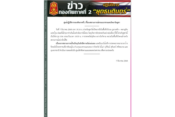 เมื่อวันที่ 7 ธันวาคม 2568 กองทัพภาคที่ 2 สรุปสถานการณ์ปะทะที่ "ภูผาเหล็ก-พลาญหินแปดก้อน" จังหวัดศรีสะเกษ ดังนี้
