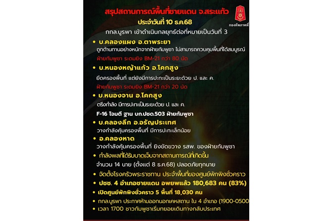 ศูนย์ปฏิบัติการกองทัพภาคที่ 1 สรุปสถานการณ์ชายแดนไทย-กัมพูชา พื้นที่ จ.สระแก้ว ประจำวัน 10 ธันวาคม 2568 เวลา 18.00 น.ว่ากองกำลังบูรพา ปฏิบัติภารกิจปกป้องอธิปไตยในสถานการณ์ความขัดแย้งไทย-กัมพูชา ในปัจจุบัน เป็นวันที่ 3 โดยมีการปฏิบัติใน 5 พื้นที่ ดังนี้