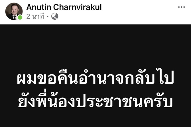 เมื่อวันที่ 11 ธันวาคม 2568 เวลา 22.05 น. นายอนุทิน ชาญวีรกูล นายกรัฐมนตรี และรมว.มหาดไทย โพสต์เฟซบุ๊กส่วนตัว ระบุข้อความ “ผมขอคืนอำนาจกลับไปยังพี่น้องประชาชนครับ” ทั้งนี้นายอนุทินได้โพสต์ข้อความดังกล่าวภายหลังได้มีการกราบบังคมทูลเกล้าฯ ร่างพระราชกฤษฎีกายุบสภาผู้แทนราษฎรเป็นที่เรียบร้อย
