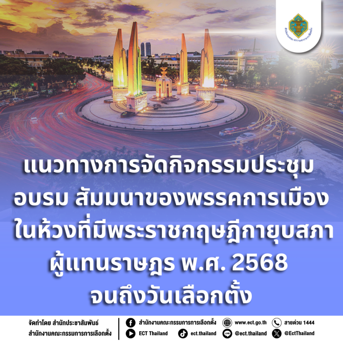 สำนักงานคณะกรรมการการเลือกตั้งขอแจ้งแนวทางการจัดกิจกรรมที่มีลักษณะเป็นการจัดประชุม อบรม สัมมนาของพรรคการเมืองในห้วงที่มีพระราชกฤษฎีกายุบสภาผู้แทนราษฎร พ.ศ. 2568 ถึงวันเลือกตั้ง โดยพรรคการเมืองสามารถดำเนินกิจกรรมทางการเมืองตามที่กำหนดในพระราชบัญญัติประกอบรัฐธรรมนูญว่าด้วยพรรคการเมือง พ.ศ. 2560 ได้ แต่ต้องพึงระมัดระวังมิให้มีการกระทำอันเป็นการฝ่าฝืน มาตรา 73 แห่งพระราชบัญญัติประกอบรัฐธรรมนูญว่าด้วยการเลือกตั้งสมาชิกสภาผู้แทนราษฎร พ.ศ. 2561 และที่แก้ไขเพิ่มเติมถึง (ฉบับที่ 2) พ.ศ. 2566 ประกอบระเบียบคณะกรรมการการเลือกตั้งว่าด้วยวิธีการหาเสียงและลักษณะต้องห้ามในการหาเสียงเลือกตั้งสมาชิกสภาผู้แทนราษฎร พ.ศ. 2561 และที่แก้ไขเพิ่มเติมถึง (ฉบับที่ 3) พ.ศ. 2565 ทั้งนี้ สำนักงานคณะกรรมการการเลือกตั้ง ได้มีหนังสือถึงหัวหน้าพรรคการเมืองทุกพรรคการเมืองทราบ (รายละเอียดตามเอกสารแนบ)