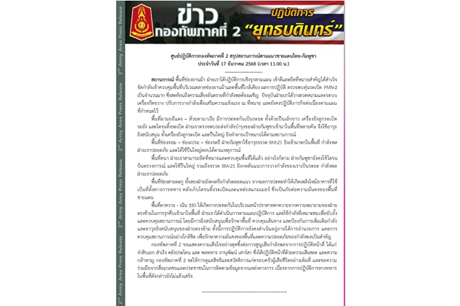 เมื่อวันที่ 17 ธันวาคม 2568 ศูนย์ปฏิบัติการกองทัพภาคที่ 2 ขอรายงานสรุปสถานการณ์การรบปะทะตามแนวชายแดนไทย–กัมพูชา วันที่ 17 ธันวาคม 2568 ในห้วงเวลา 12.00 น. ของวันนี้ โดยมีเหตุการณ์ที่สำคัญดังนี้