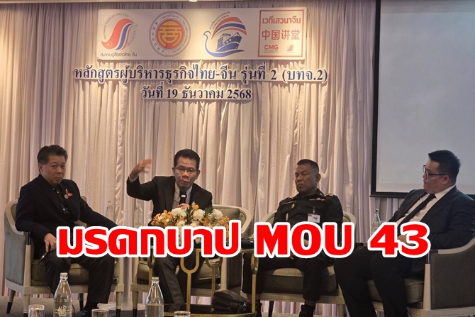 สมาคมผู้สื่อข่าวไทย-จีนตั้งวงเสวนาถกโอกาสทางธุรกิจในศึกไทย-กัมพูชา “สว.ชิบ” เปิด 8 เหตุผล กมธ.วุฒิสภา ยกเลิก MOU 44 เพื่อป้องกันไทยเสี่ยงเสียผลประโยชน์ทางทะเล ขณะที่ “เจ้ากรมแผนที่ทหาร” ชี้ปัญหาเขตแดนไทย-กัมพูชาเป็นมรดกบาปจากยุคอาณานิคมทำ 2 ชาติทะเลาะกัน ค้านยกเลิก MOU 43 ส่งผล 20 ปีทำไทยสูญเปล่า ด้าน “นักวิชาการดัง” ยันต้องใช้ MOU 43-44 เดินหน้าแก้ปัญหาให้จบ แนะยึดกลไก 3 ระดับ “GBC-JBC-RBC” ยุติทุกข้อขัดแย้ง
